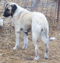 DOB 1/1/2006: Kaylee is a purebred Anatolian that came here as a puppy. She is now well over 100 pounds. She is friendly and good natured, but is learning to take her job guarding the goats very seriously. When Kaylee has just a youngster, she spotted a pack of dogs on our property. She wanted to play, but the dogs tore her up pretty well. She came home and hid for several days. When she recovered from the shock, we could see that she had learned a big lesson. Since that time, Kaylee has been a great protector of her herd and won’t make that mistake again.