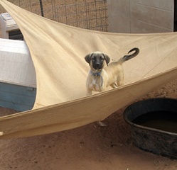 Blue, DOB 7/8/97 is our hard-working 75 lb. male Anatolian Livestock Guardian Dog (LGD). Purchased from a fantastic breeder/trainer in Texas in late January of 2002, Blue took immediately to our goat herd (his charges) and has been fiercely protective of his territory from all types of predators. We've seen him really in action and he is awesome.