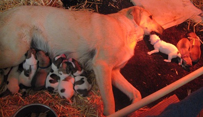 Little did we suspect when Anatolian Livestock Guardian Dog (LGD) Mattie came to work here in November of 2011 that she had a secret. However as the weeks went by we eventually guessed that secret. On January 3rd, 2012 Mattie took some time off from guarding her goat herd to whelp 9 beautiful, healthy puppies. Mattie was a great mom and did a wonderful job of teaching her pups how to be LGD's. They have all gone to new homes now and are working very nicely.