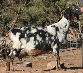 This girl has just got to be the most elegant lady on the ranch. She has a long, graceful neck, nice length and width, an excellent udder, and easy-going temperament. She scores as Excellent in conformation and is a Superior Genetics doe with multiple International Nubian Breeders Association awards.