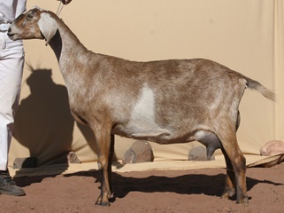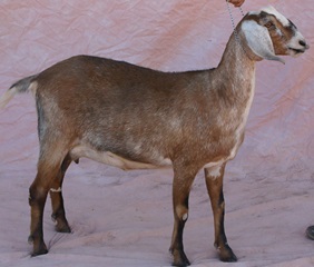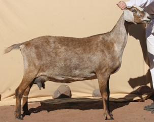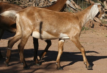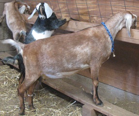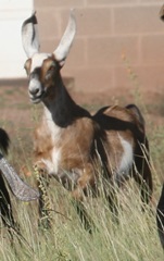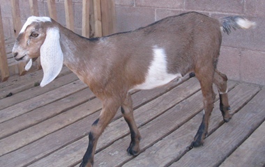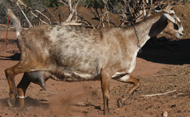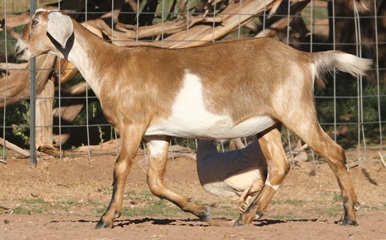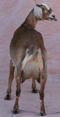 Betty absolutely loves being a goat and doing goaty things. She can vault barriers with style and slip through doors with ease. She is fun to watch, which is good since she really does need to be watched - otherwise she might just get into more trouble. She is a lovely girl full of confidence and grace. She is long and level with great strength of bone and wonderful dairyness. Both her dam and granddam are ultra-productive does that have gorgeous udders with lovely plumb teats. We expect Betty to join them in making us proud.